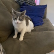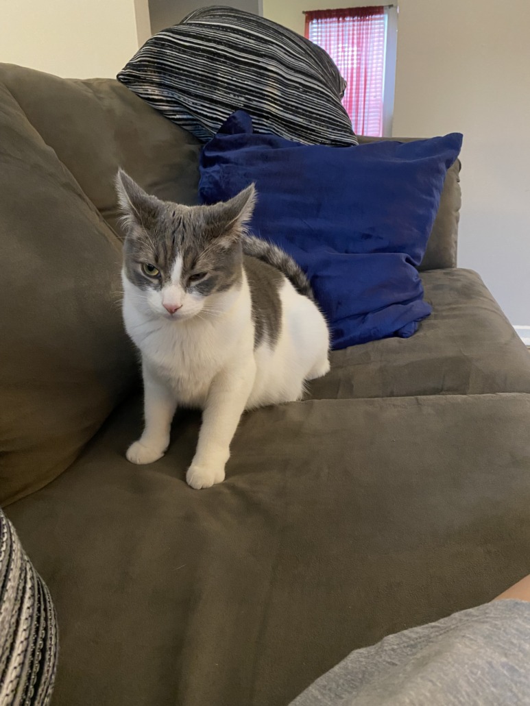 Henry has a white chest and tummy with a grey striped head, back, and tail. He may have a limp due to a traumatic hip injury. Was hit by a car before I adopted him so he’s very nervous