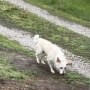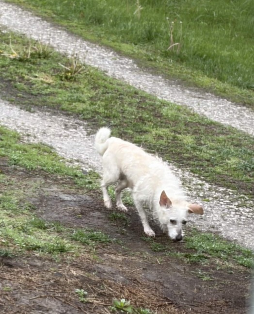 Small white/beige terrier male running through yards, no collar