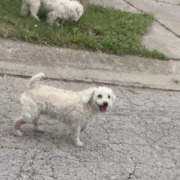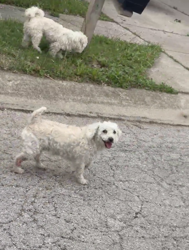 Two small white miniature poodle mixes. One of the em has an injured back right leg.
