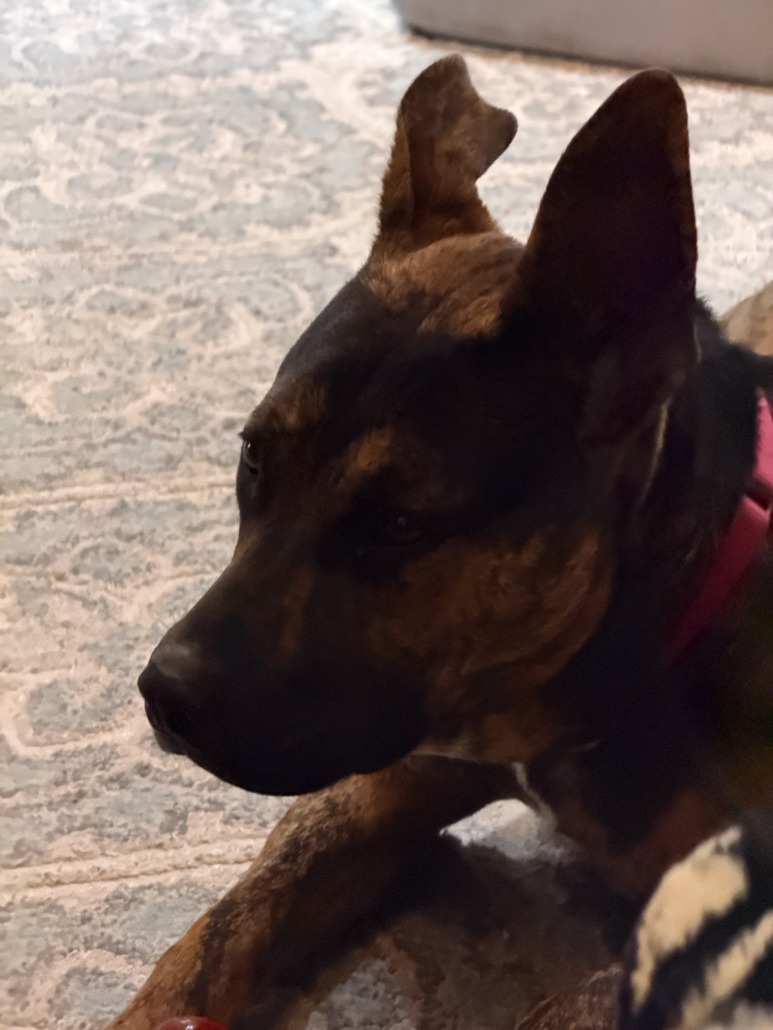 Very nice dog. Has been missing for a long time. Black and brown pitbull mix.