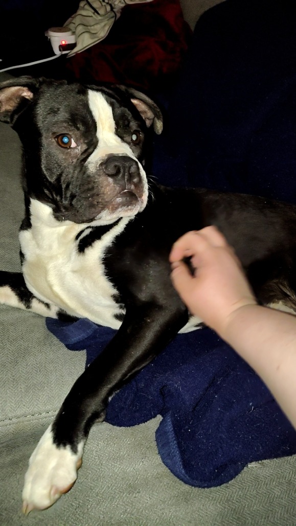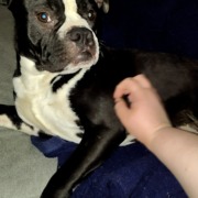 Very friendly black and white boxer/bulldog/pit mix it seems. Proof of ownership required, I’d love to get him back home!