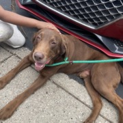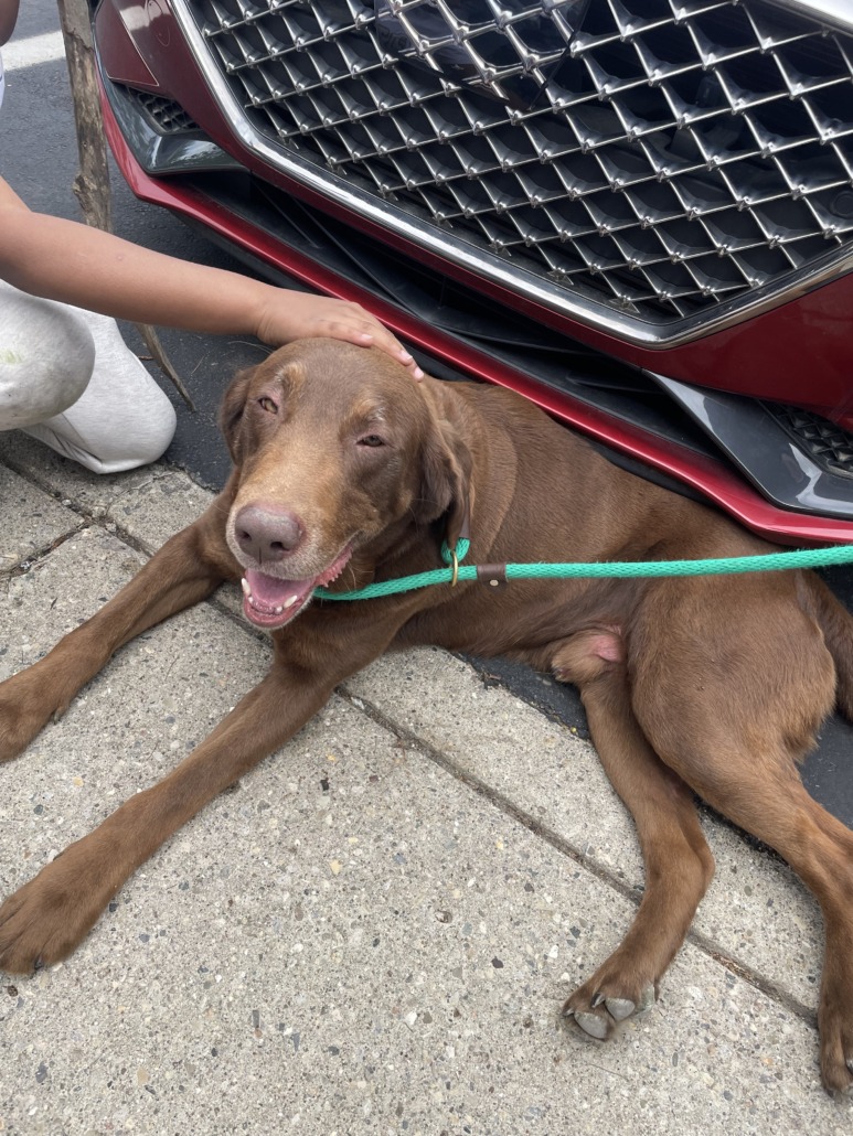 Brown lab, not fixed, middle aged/older, knows sit and lay down. Has lots of redness/irritation on underside. Very sweet and friendly.