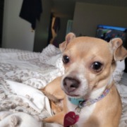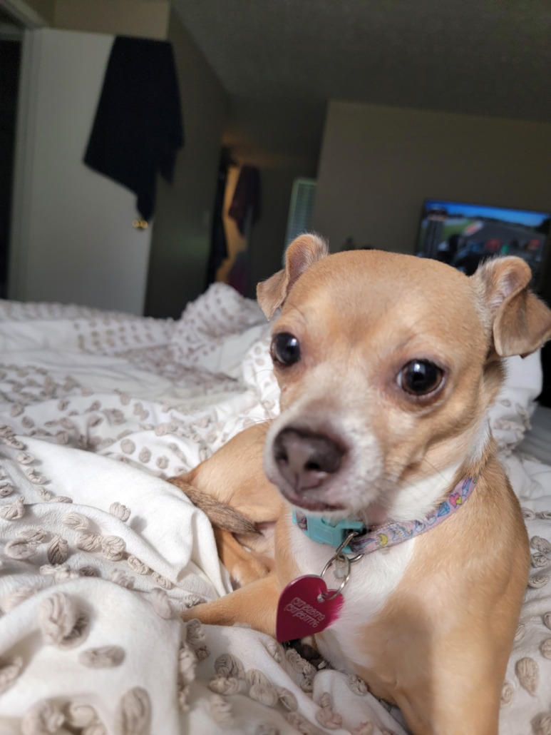 Chili is a chihuahua brown and white