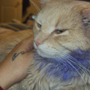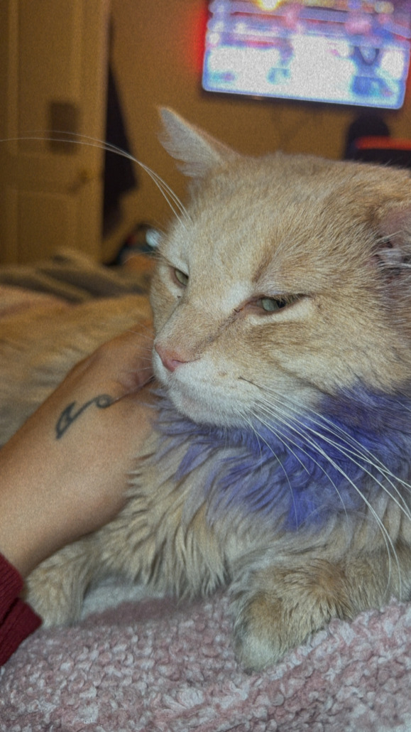 This is my boy simba. He is a very healthy tan cat! He has purple on his neck as in the photo from an antibiotic spray for a bite he had gotten! He’s very loved and missed
