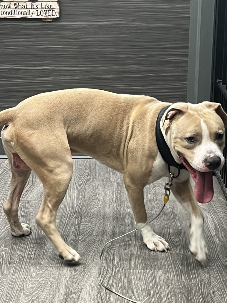 Intact male with black collar tied to a tree outside Per Supplies Plus