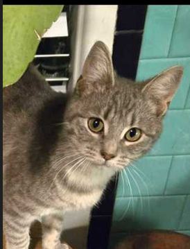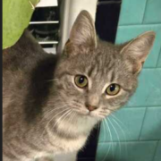 Grey Tabby with dark stripes friendly and approachable..