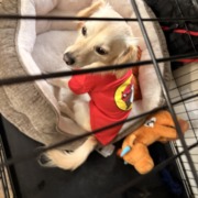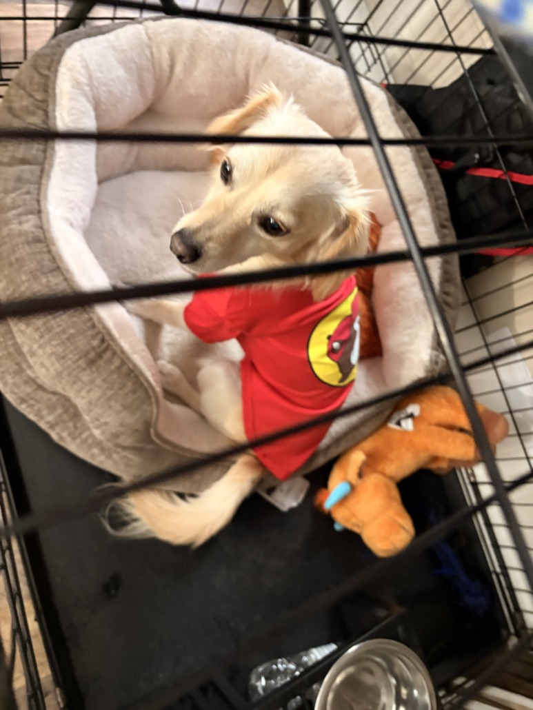 My dog ran away towards the raceway and 10th Street. If you see him, please send me an email. He’s wearing a green collar and a red Bucee’s shirt, just like in the picture.