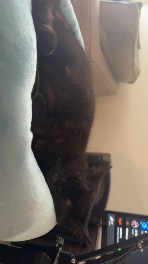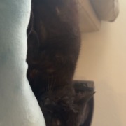 All black cat with green eyes and only about 9 months old. He also has a black collar with a little silver bell and white lightning bolts all over it.