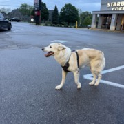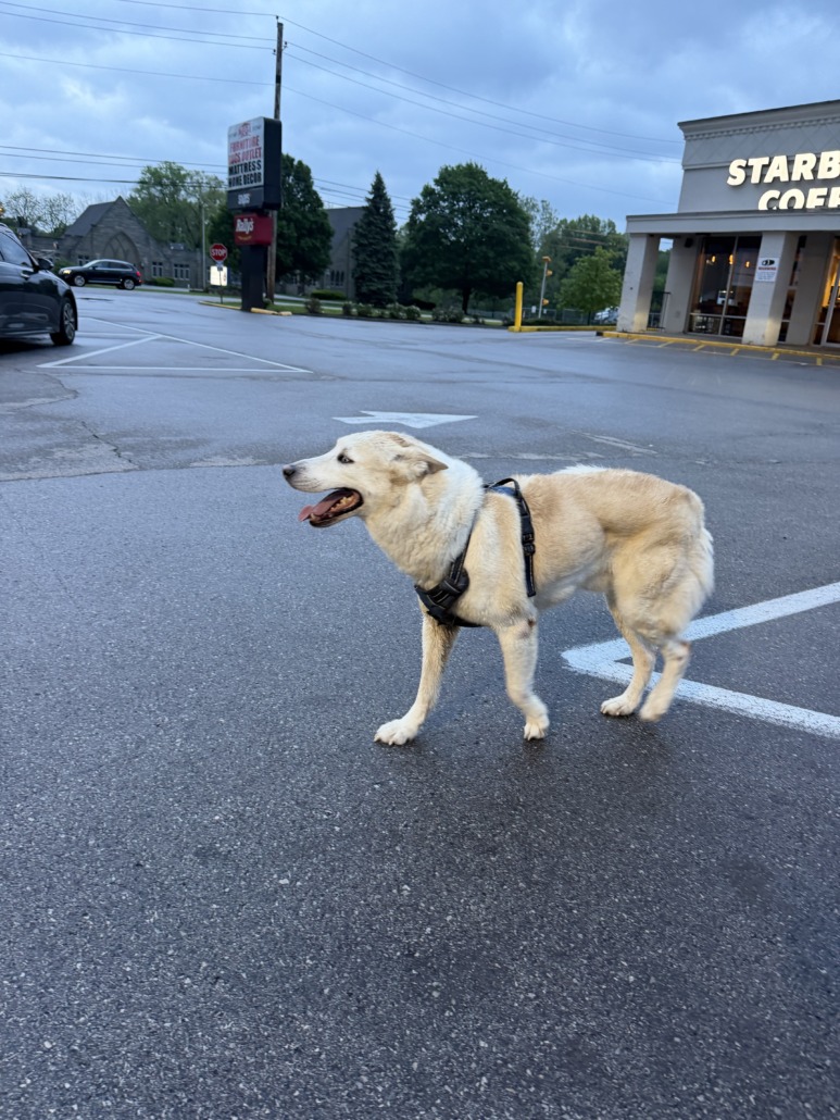 Looks like a husky mix. Was wet, likely had been out all night. Has a blue harness. Skinny.