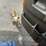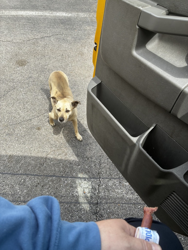 Tan medium-sized female dog, short hair. Possibly pregnant.